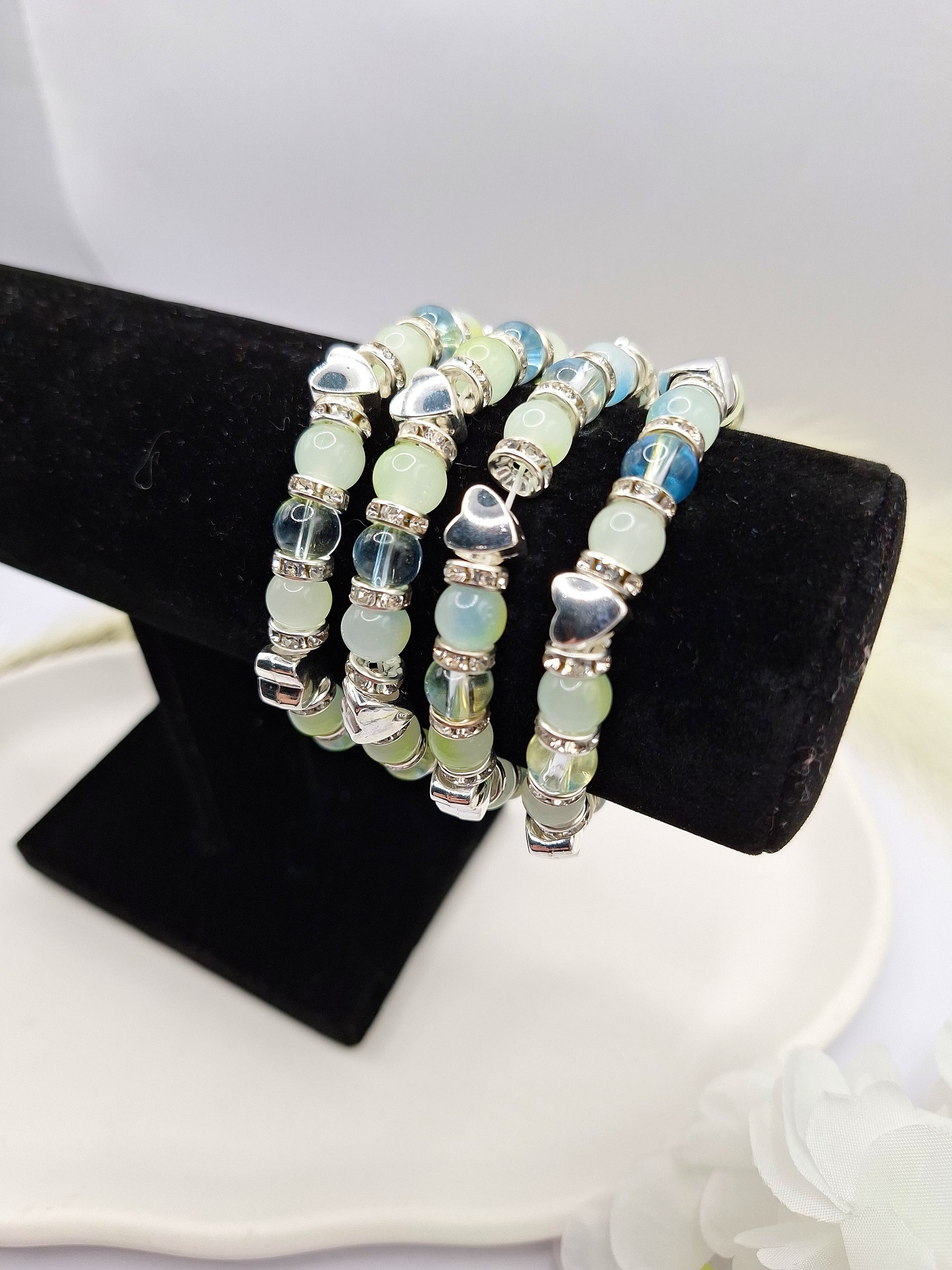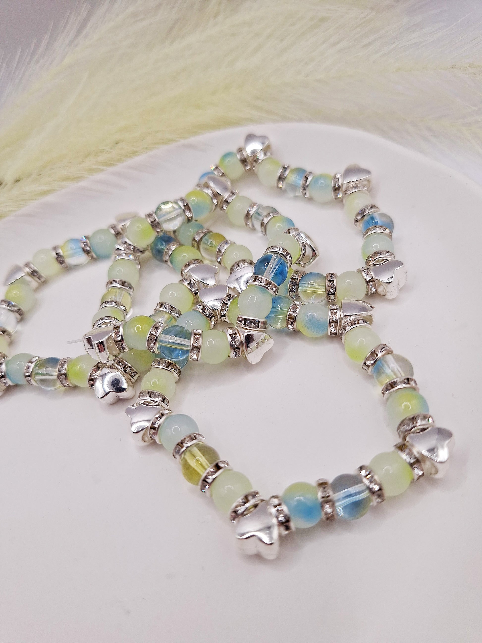 Grünes elastisches Perlenarmband mit silbernen Perlen in Herzform ♥