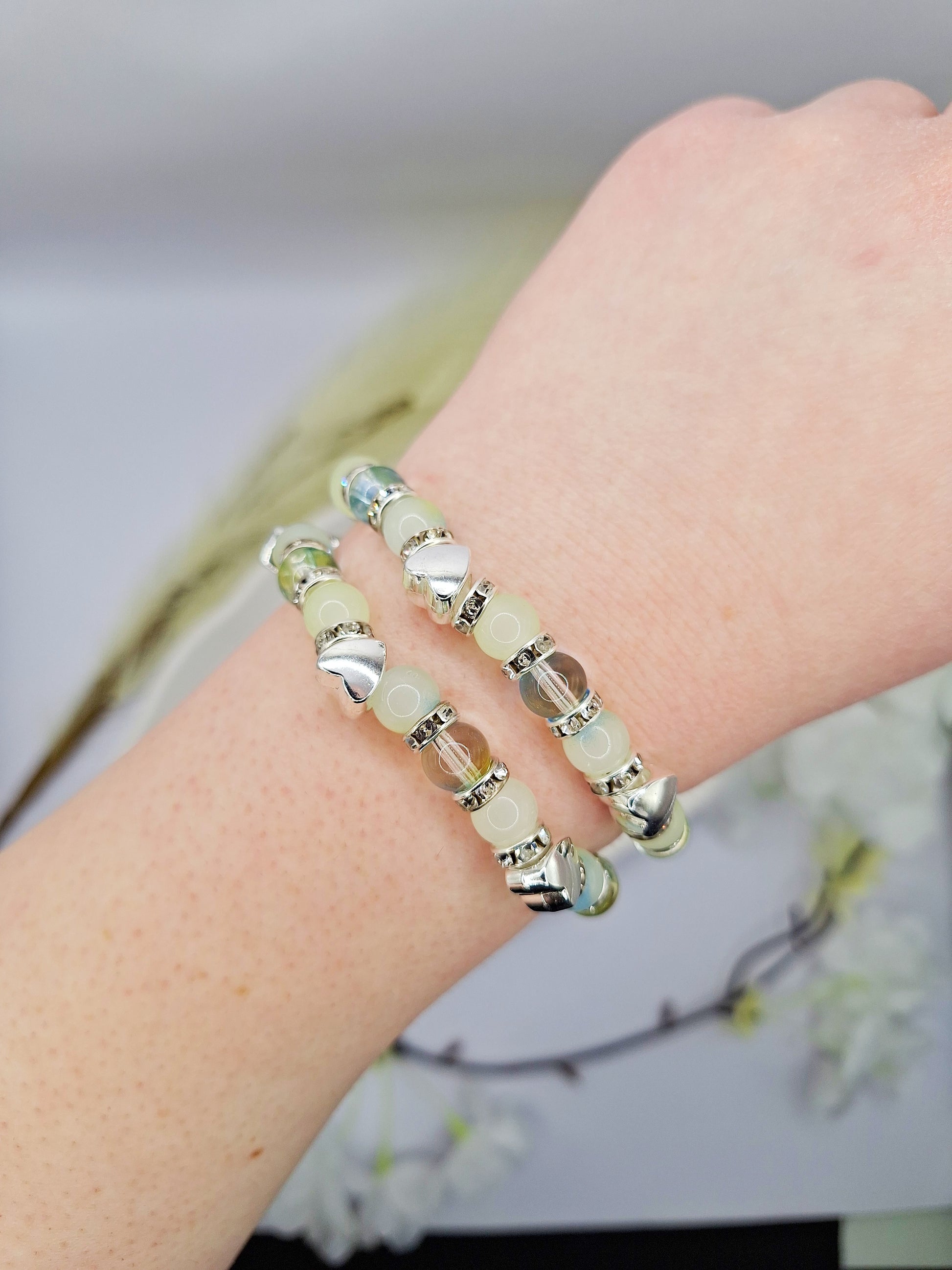 Elastisches Perlenarmband in Grün mit silbernen Perlen in Herzform