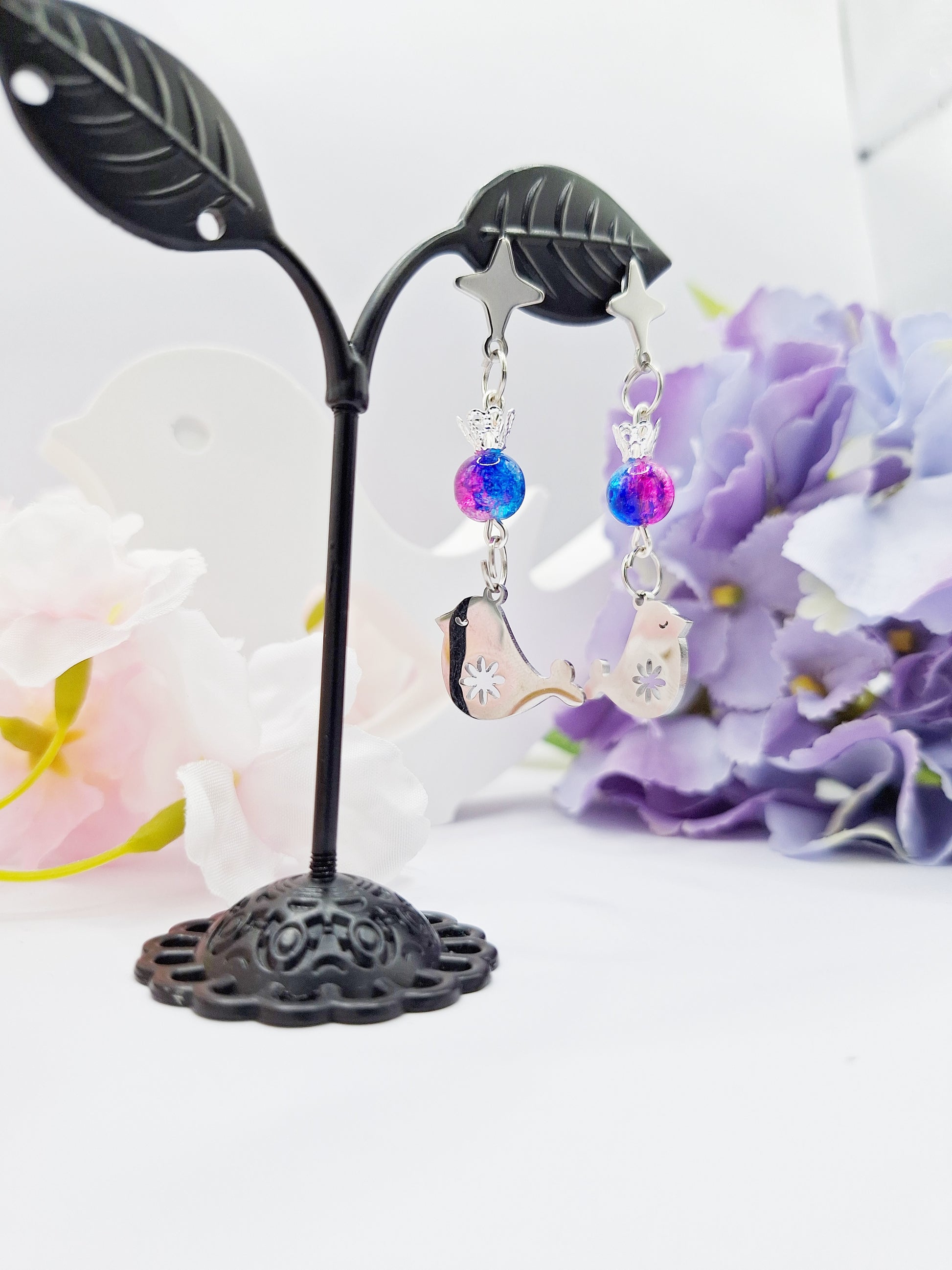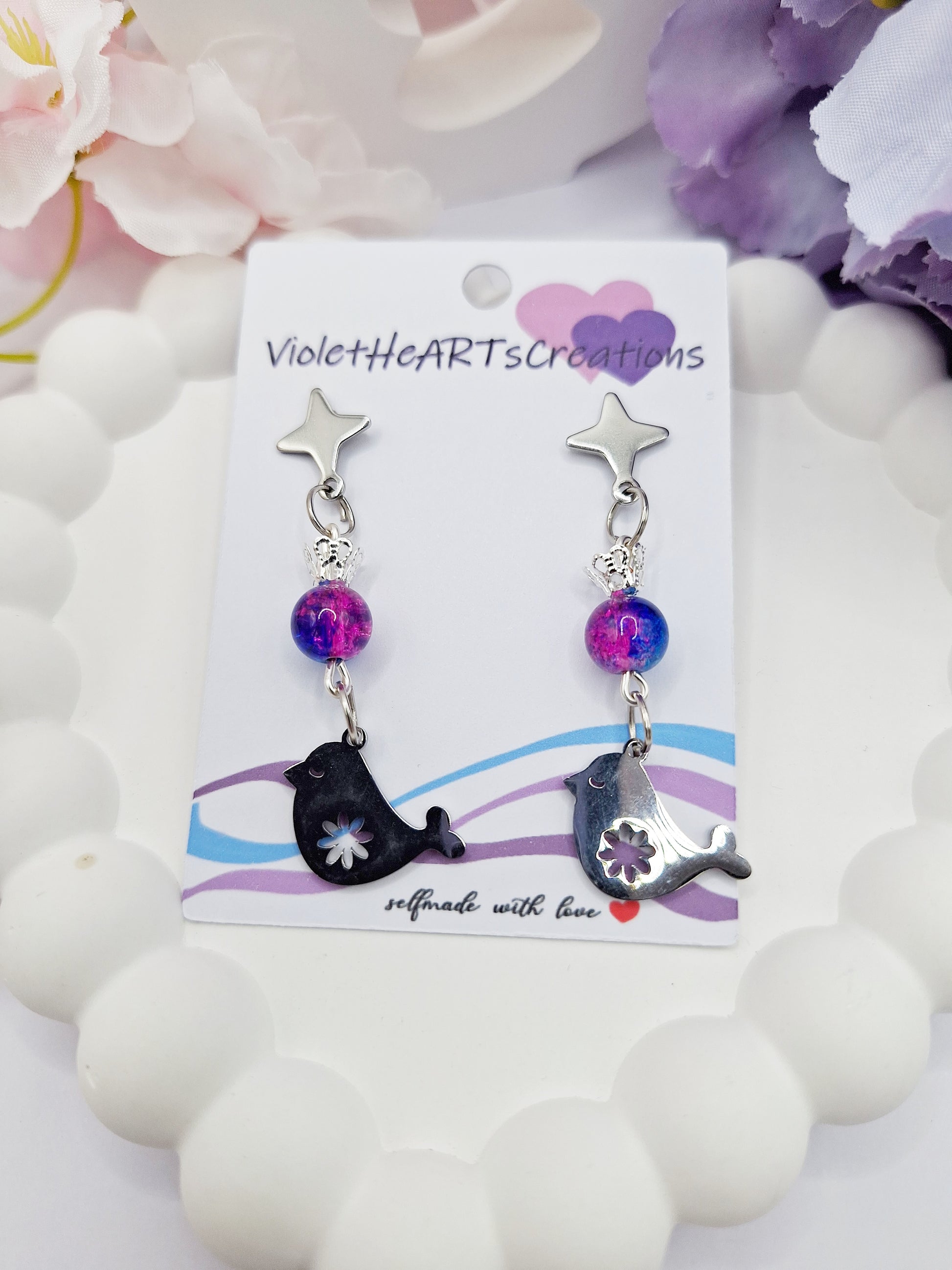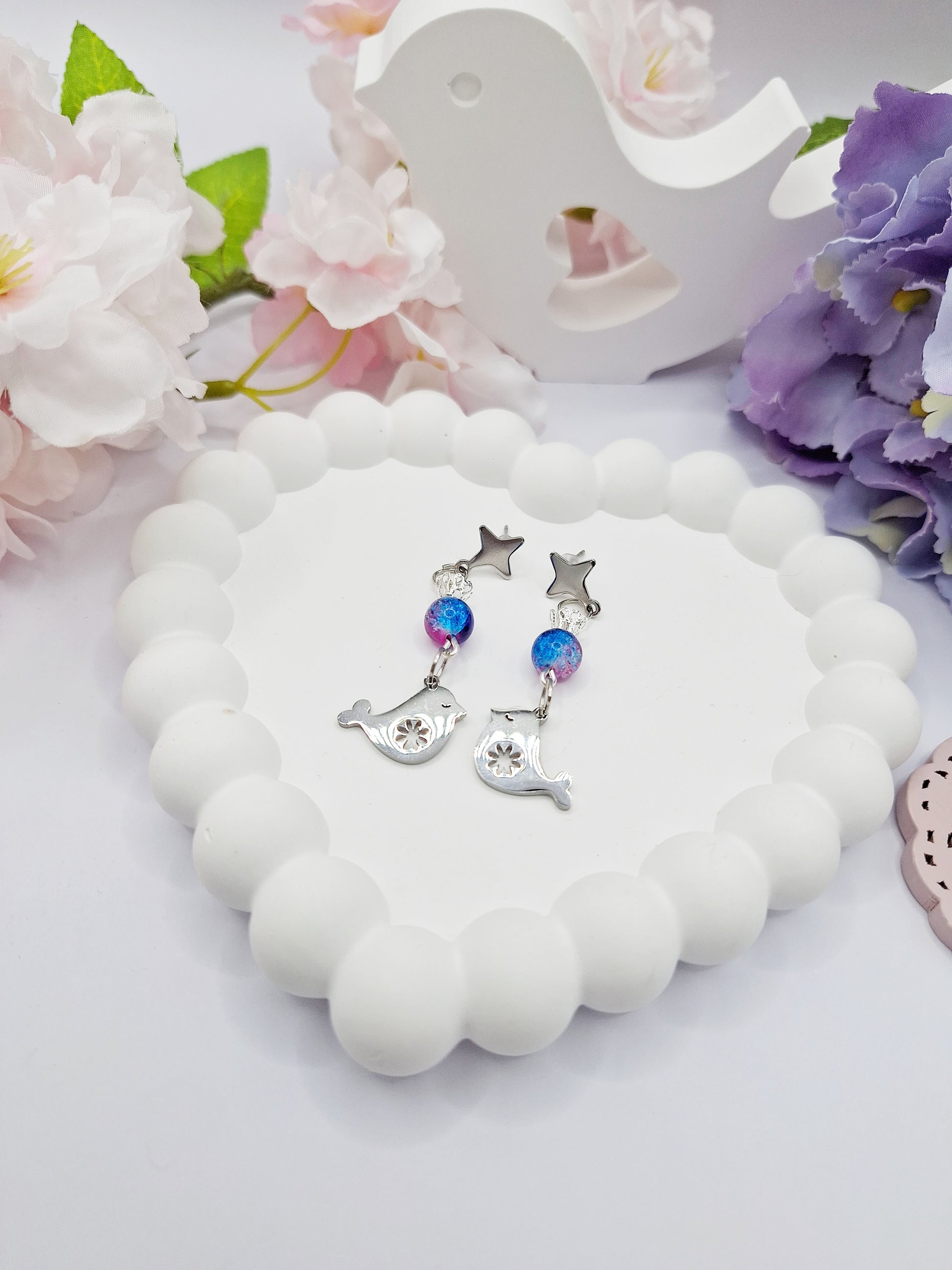 Hängende Ohrringe (hinten mit Stecker) mit blau-violetter Perle und Vogelanhänger in Silber ♥