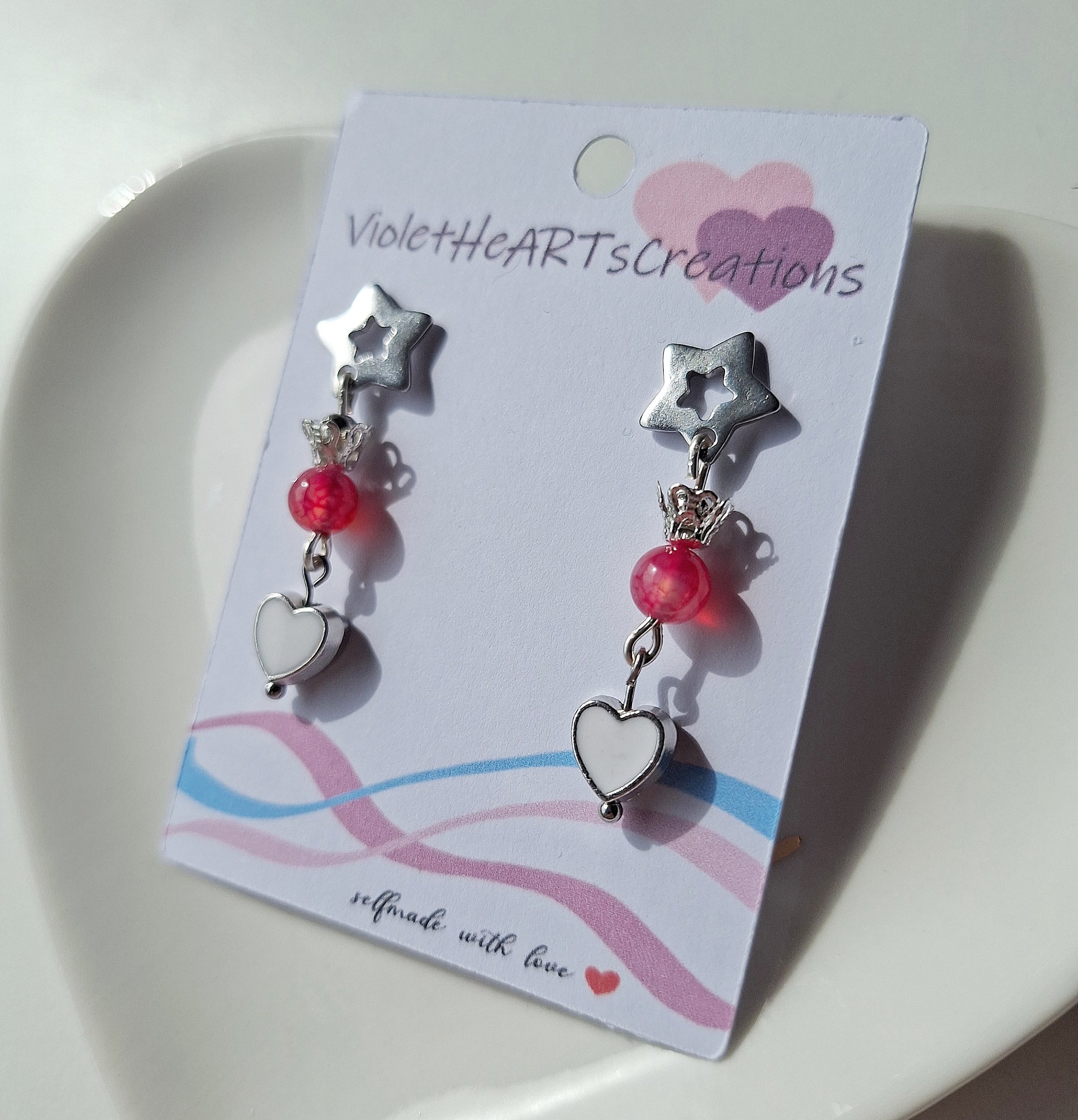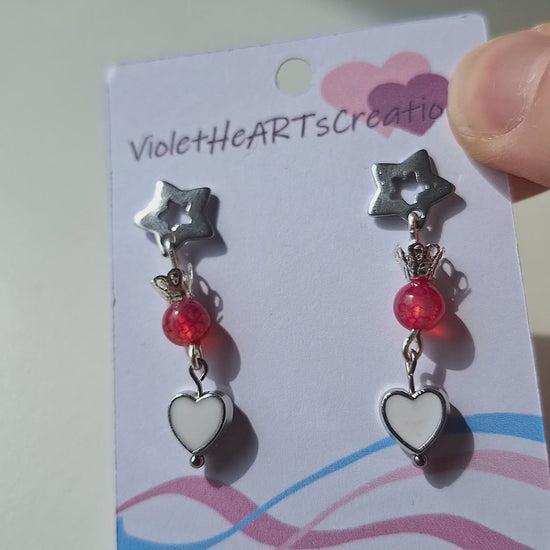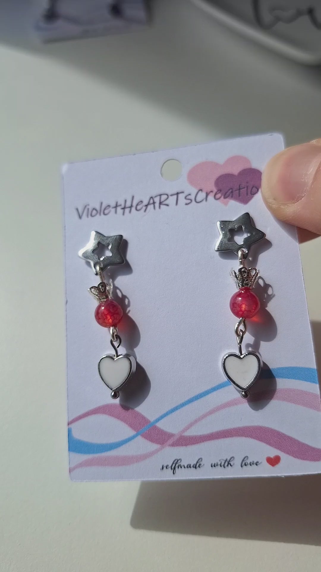 Wunderschöne Ohrstecker in Sternen-Form mit roter Perle und weißem Herz. Sie sind in der Farbe Rot gehalten und verzaubern jedes Outfit. Sie eignen sich hervorragend als Geschenk oder zum Aufpeppen diverser Outfits. ♥